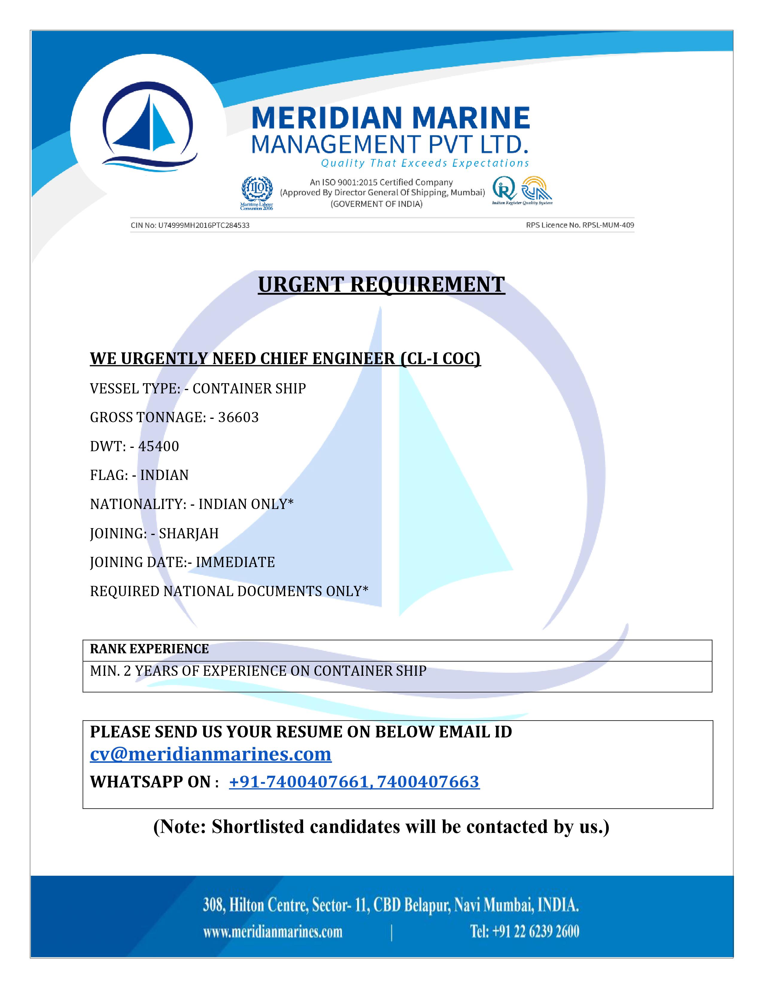 Meridian Marine Management Private Limited is a leading ship management company based in India providing a complete range of ship management services for all types of vessels to reputed Ship Owners / Ship Managers & Charterers across the globe.