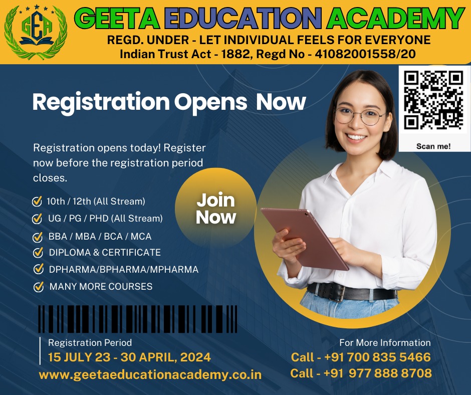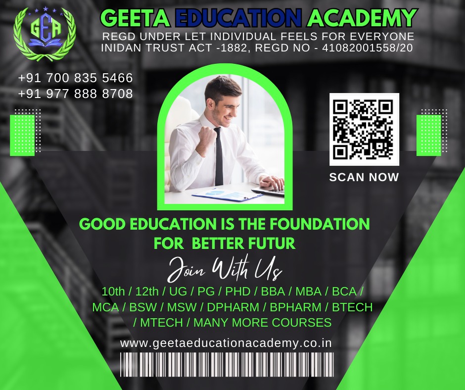 Welcome to Geeta Education Academy, where education meets excellence! As a premier educational institute, we are dedicated to nurturing the minds of tomorrow through a diverse array of high-quality academic programs. As a beacon of learning and innovation, we are committed to providing unparalleled education.GEETA EDUCATION ACADEMY is sister concern organization of LIFE - Let Individual feels for Everyone, Charitable Trust, Registered with Indian Trust Act 1882 , vide Regd No - 41082001558/20. In order to empower individuals with knowledge, Geeta Education Academy created a dynamic and enriching learning environment in order to provide them with the opportunity to learn. In addition to meeting each student's individual needs, we are committed to transforming lives through education.