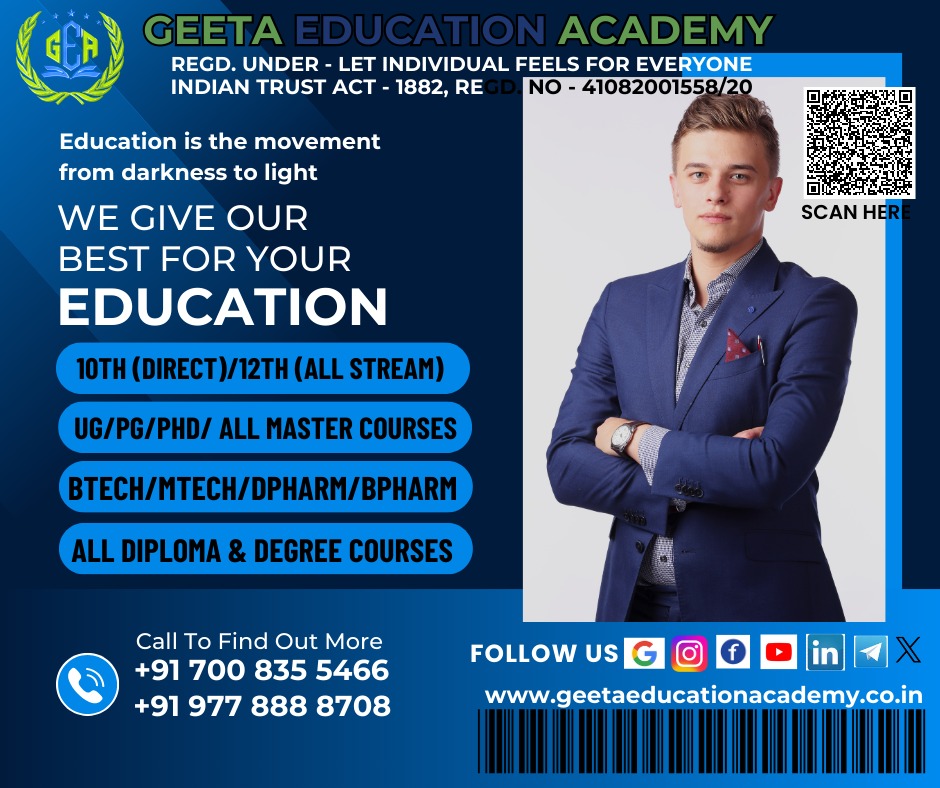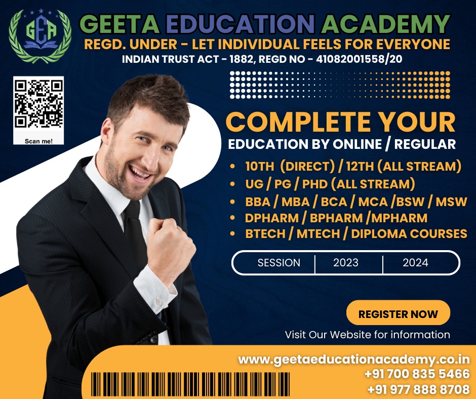 Welcome to Geeta Education Academy, where education meets excellence! As a premier educational institute, we are dedicated to nurturing the minds of tomorrow through a diverse array of high-quality academic programs. As a beacon of learning and innovation, we are committed to providing unparalleled education.GEETA EDUCATION ACADEMY is sister concern organization of LIFE - Let Individual feels for Everyone, Charitable Trust, Registered with Indian Trust Act 1882 , vide Regd No - 41082001558/20. In order to empower individuals with knowledge, Geeta Education Academy created a dynamic and enriching learning environment in order to provide them with the opportunity to learn. In addition to meeting each student's individual needs, we are committed to transforming lives through education.